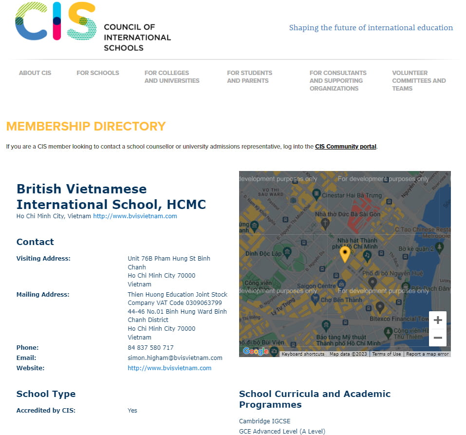 Trường BVIS được kiểm định bởi CIS (Council of International Schools – Hội đồng các trường quốc tế) và WASC (Western Association of Schools and Colleges – Hiệp hội các trường phổ thông và đại học Miền Tây Hoa Kỳ). Đây là vinh dự ít trường quốc tế tại Việt Nam có được, là bảo chứng cho chất lượng đào tạo của nhà trường.