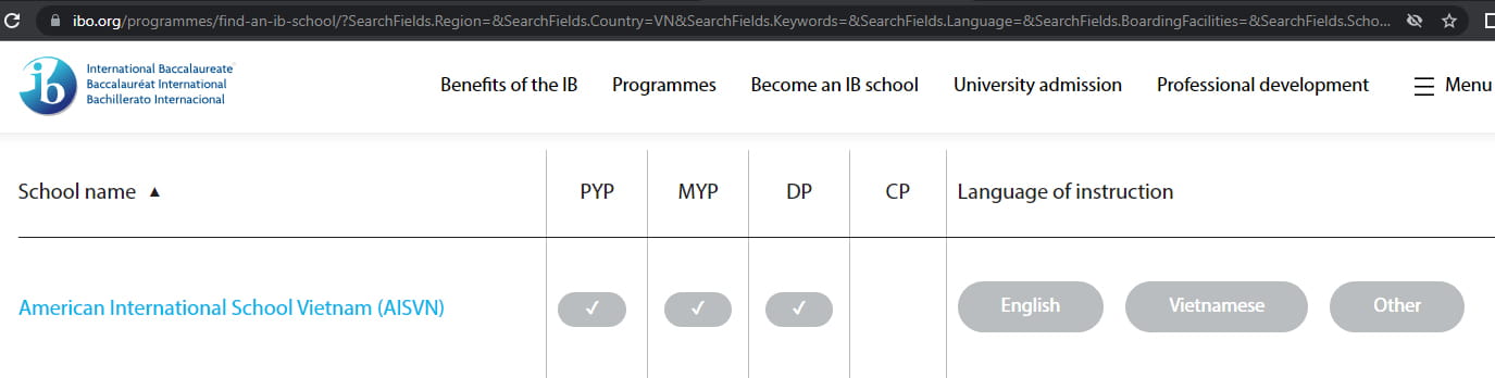 - Tiểu học: Chương trình Tú tài Quốc tế Tiểu học (IB PYP)